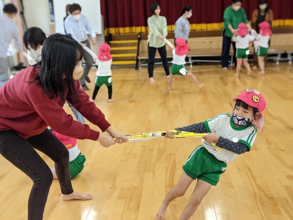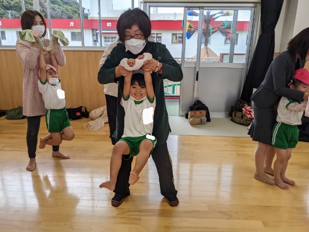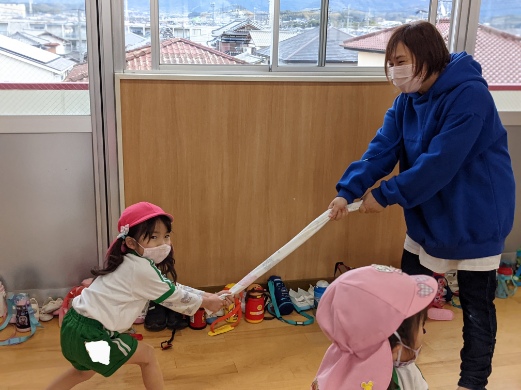みんなで体をほぐしてから、持ってきて頂いたフェイスタオルを使って綱引きをしました。