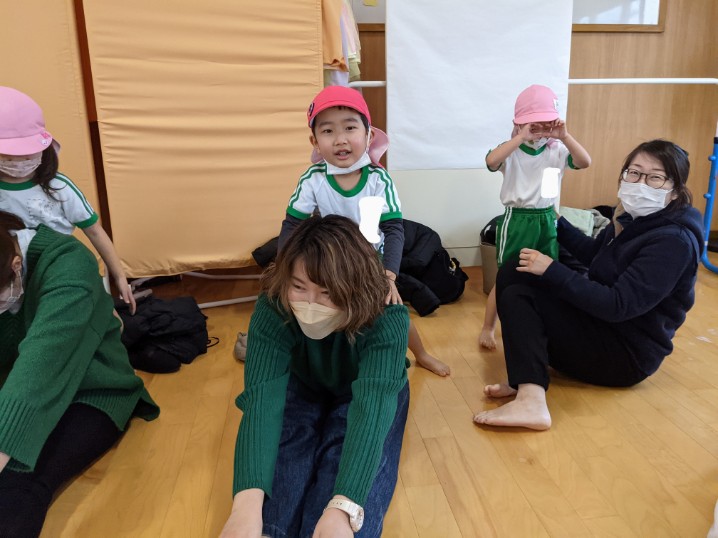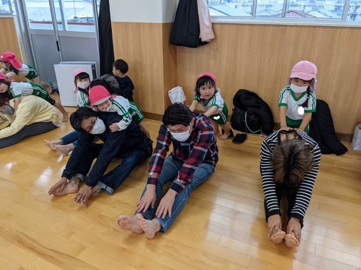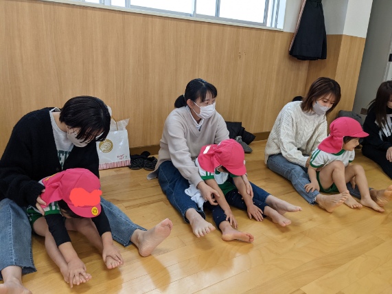 緊張している様子でしたが、お家の方と一緒に手足をぶらぶらしたり、前屈をしたりして体をほぐすとだんだんと笑顔が増えてきました。