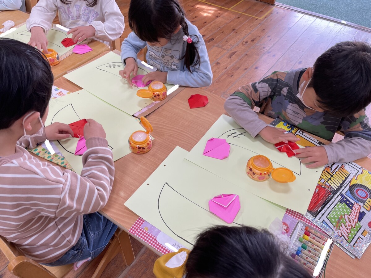 2023.04.26 花鶴丘幼稚園 昨日の雨はやみ、今日はとても晴れた1日となりました。 今日は昨日できなかった外遊びができてとても楽しそうでした。運動場には水溜りができていていつもと違った遊びができワクワクしている様子が見られました。 お部屋ではいちごの折り紙製作をしました。体を先生の方に向けてしっかりと話を聞き、丁寧にすることが出来ました。途中難しい折り方がありましたが一生懸命頑張っていましたよ😊 さて、明日は遠足となっています。元気いっぱい楽しみましょう! 今日の担当は、はな3くみ 星川 でした。