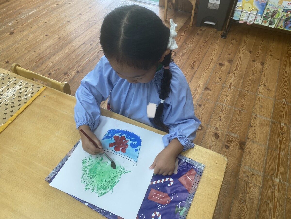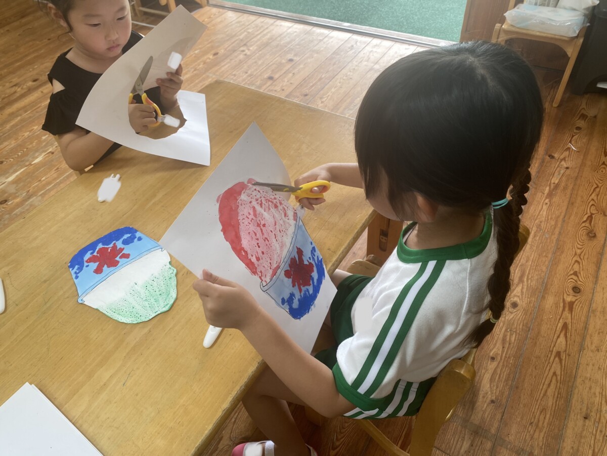 まずは氷の部分を白でしっかりと塗り込み、その後シロップの部分を絵の具で塗り、はじき絵をしましたよ☺️