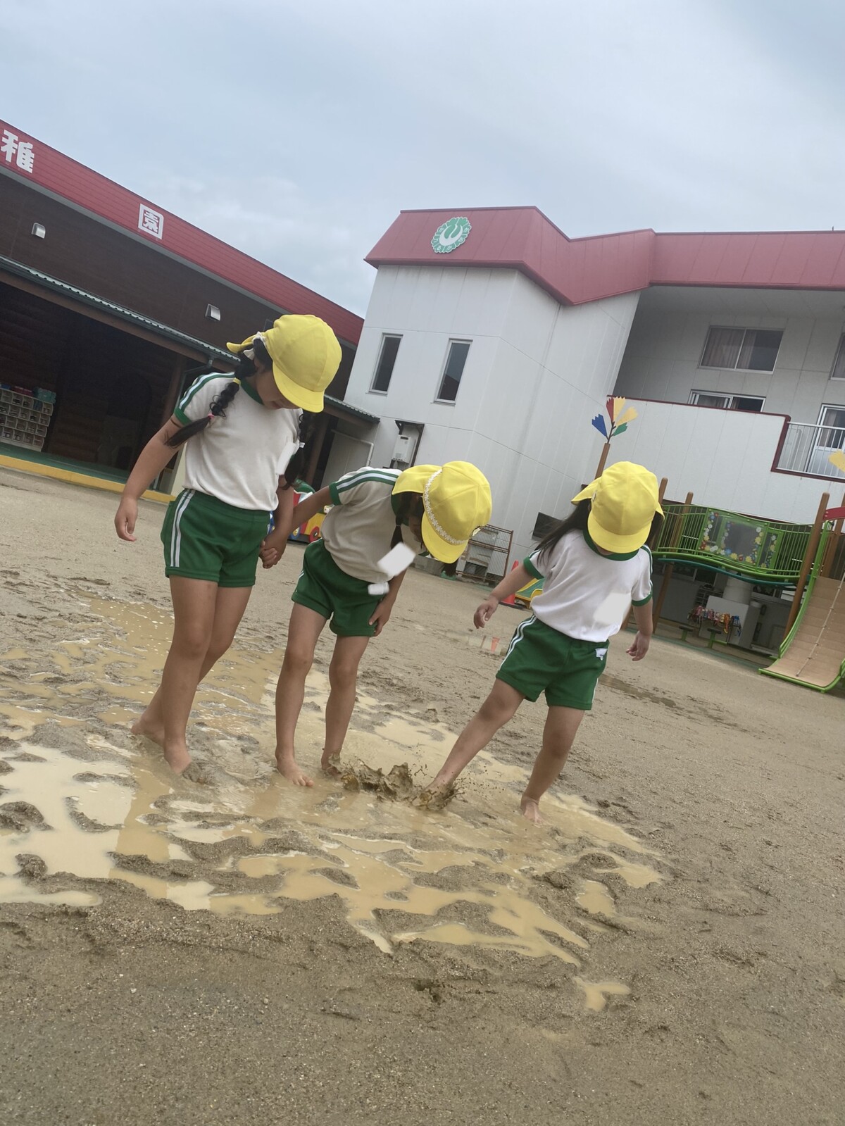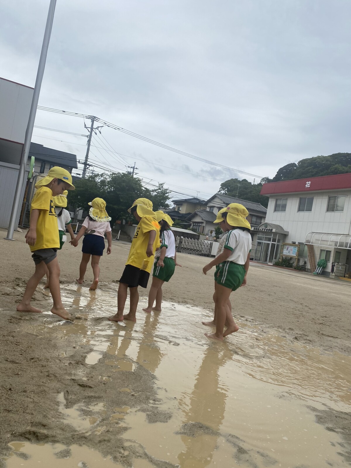 午後からは雨上がりの園庭にできた水溜りで、裸足になって遊びました🤗
