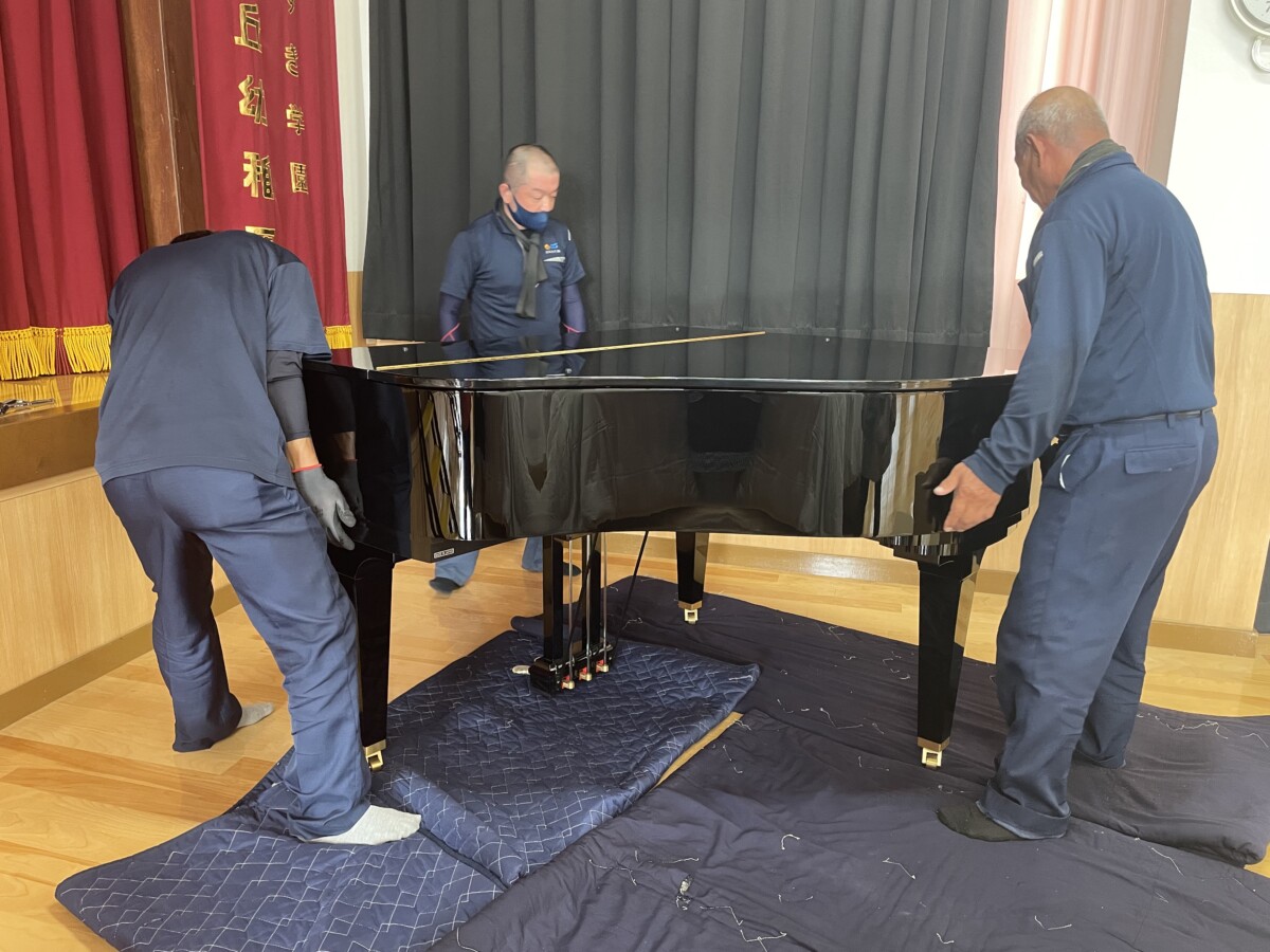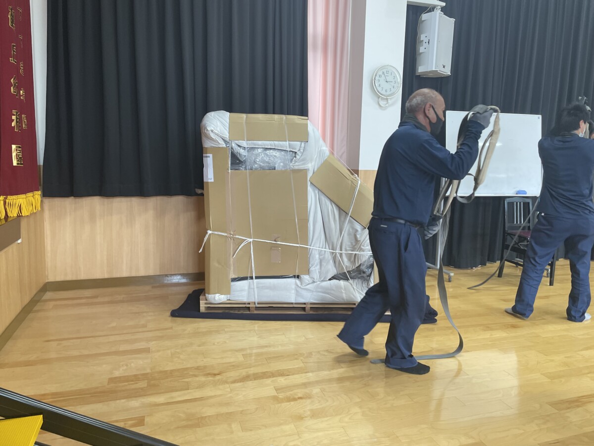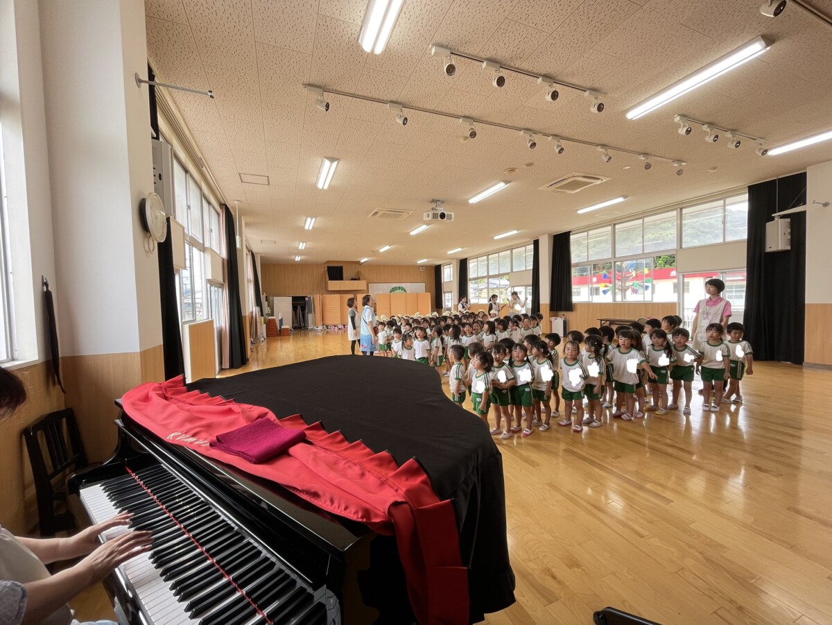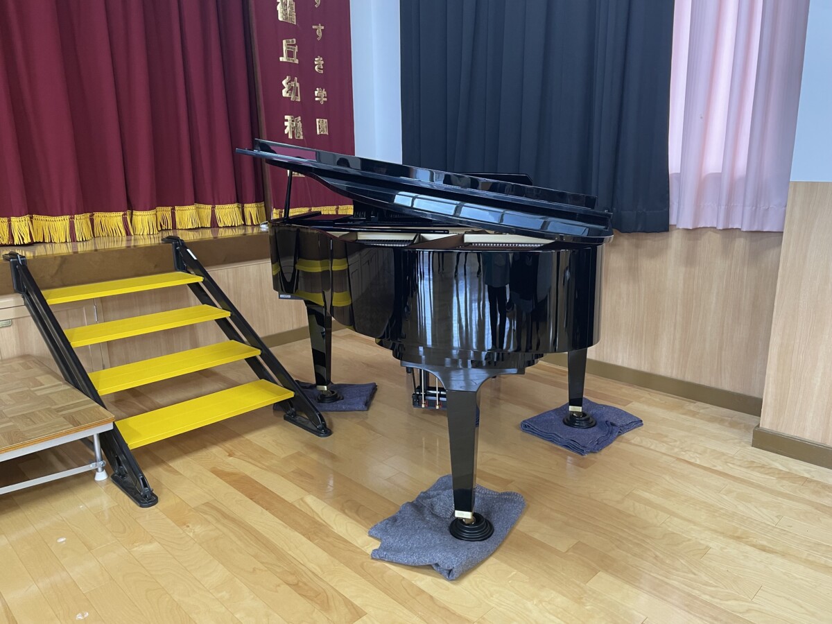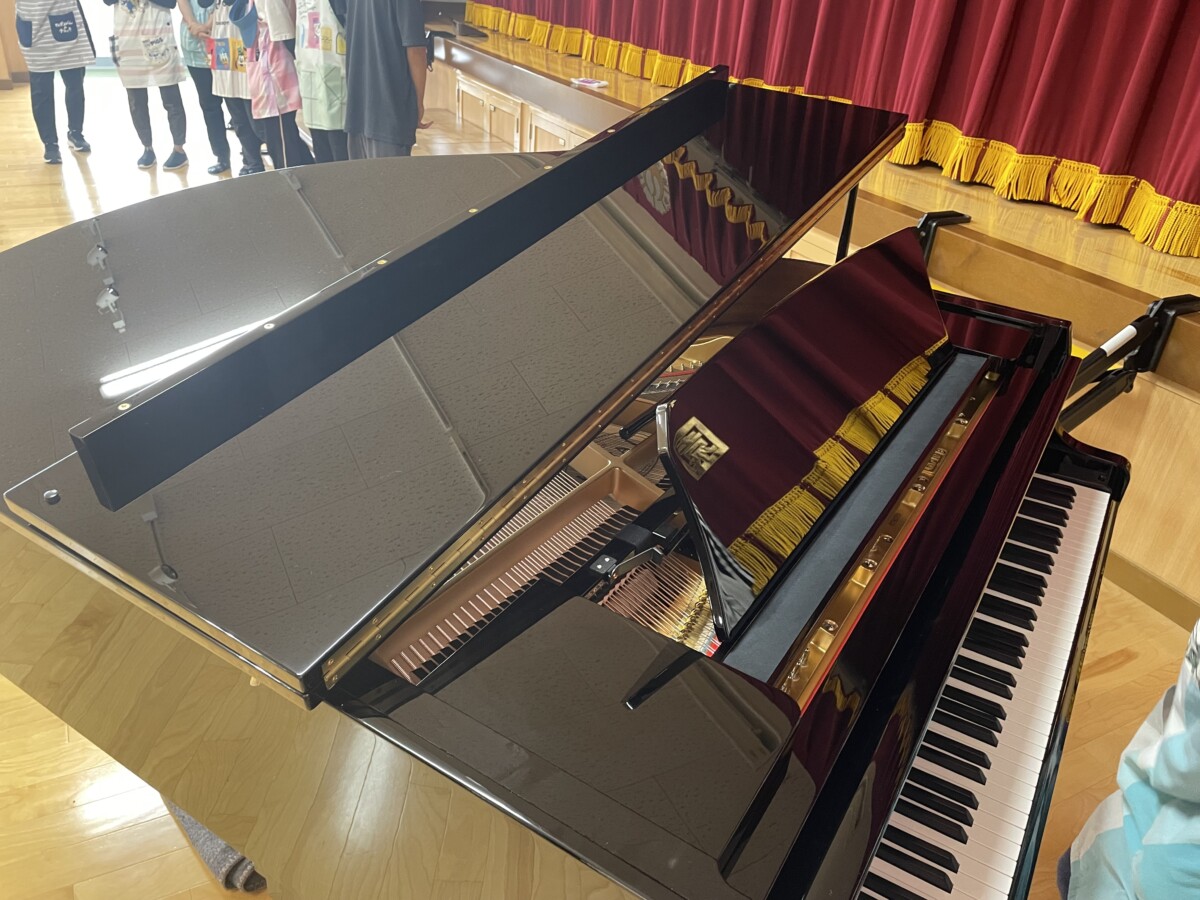 夏休みの最終日、花鶴丘幼稚園体育館に🎵グランドピアノ🎵が届きました。8月28日一学期後半全体朝礼で体育館に集まった子ども達も直ぐに気づいて「おっきなピアノがある!」「ピアノあたらしいね!」と興味津々でした。今日はゆめぐみ4クラス体育館でダンスの練習をする前に朝の会をしました。花鶴丘幼稚園の歌や朝の歌の伴奏は、勿論!ピカピカのグランドピアノ♪いつも以上に元気よくニコニコ歌う子ども達の姿が印象的でした。