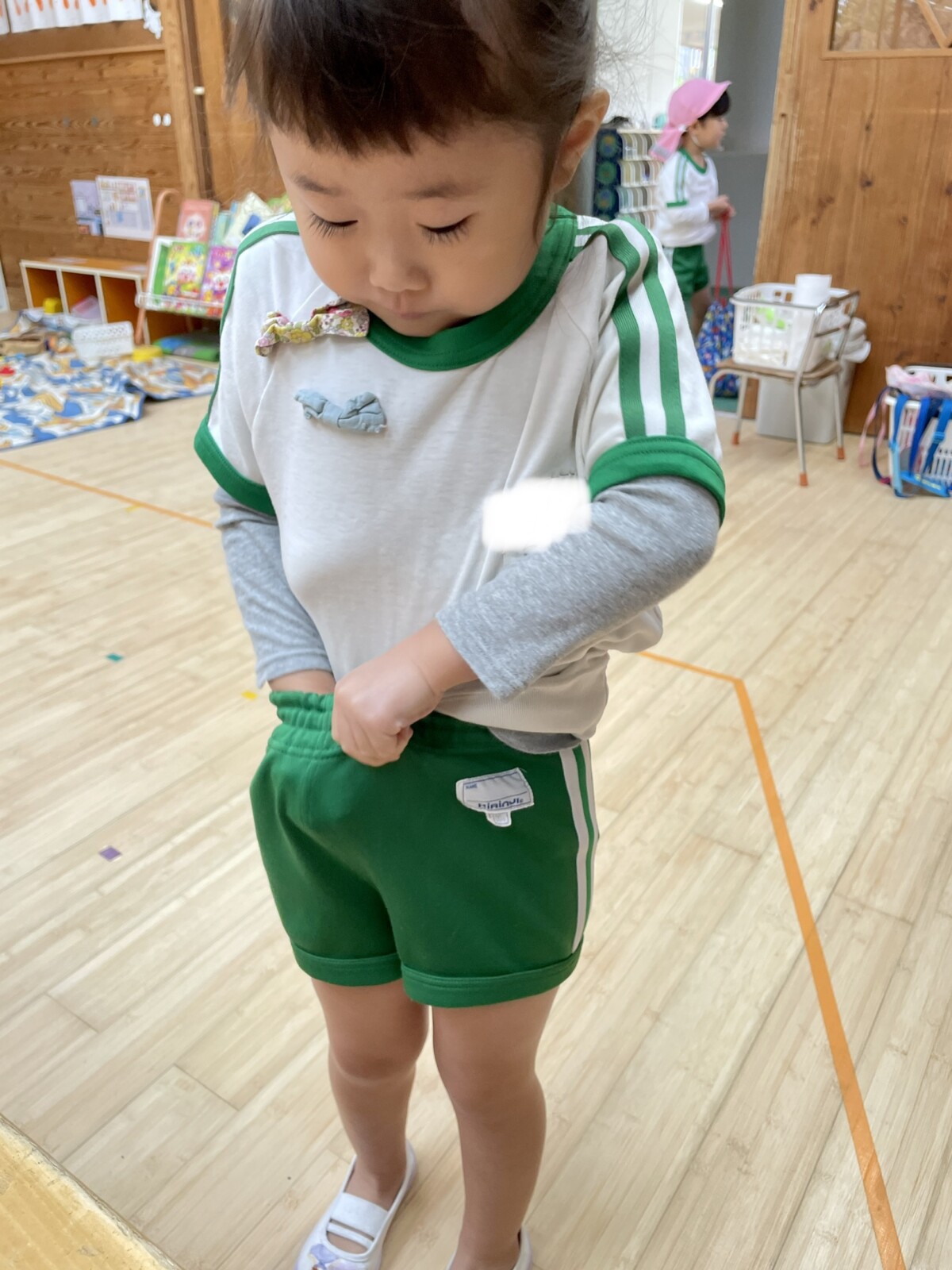 そして、体操服を着たら綺麗にシャツも入れます。