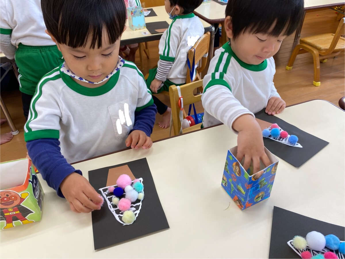 ポンポンの大きさや色の配置を子どもたち自身で考えながら可愛いツリーが完成していましたよ✨