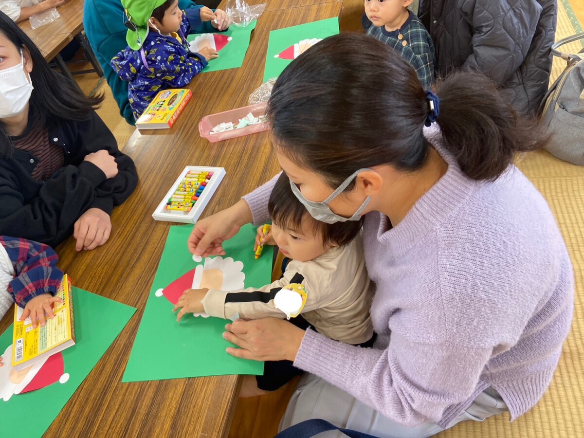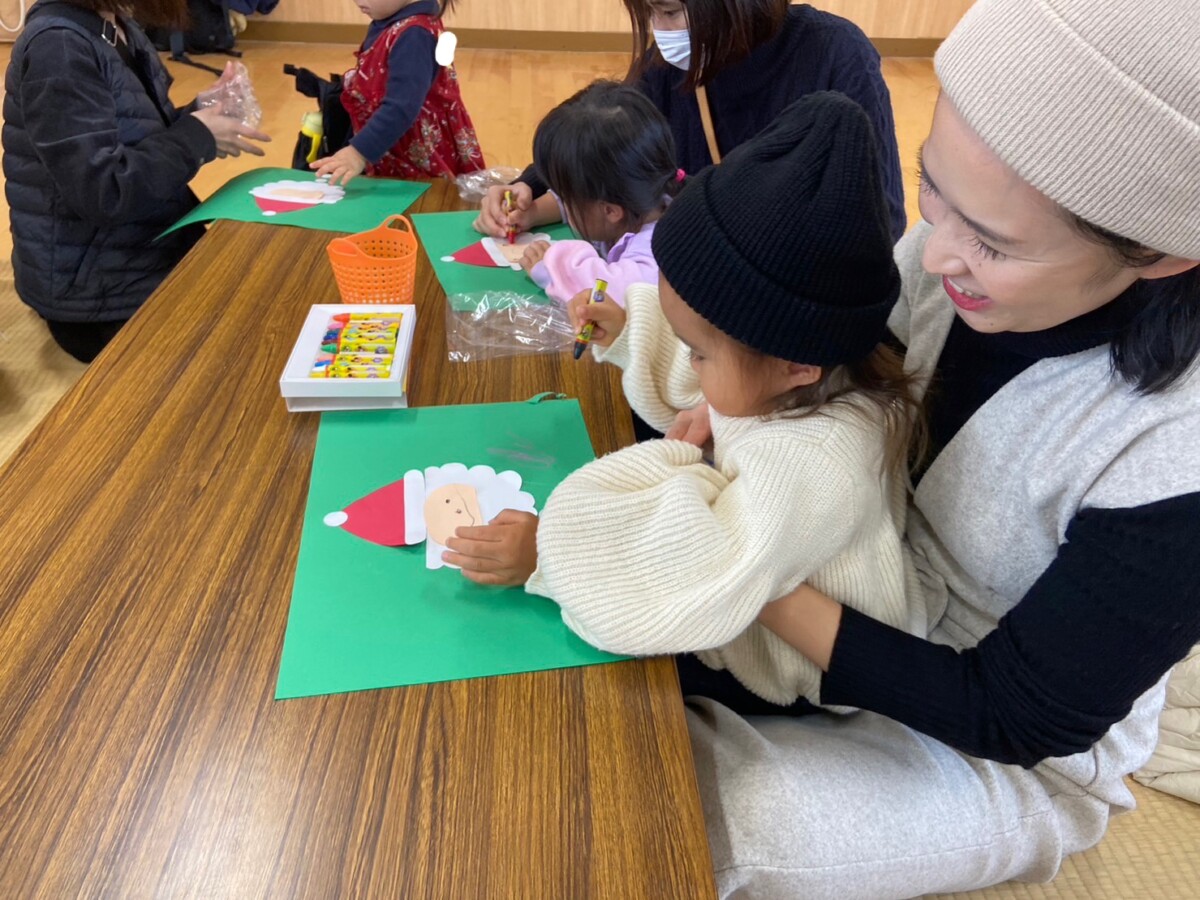 その後、クリスマス製作で顔を描いたり、シールを貼ったりと親子で楽しむ姿が見られました👀
