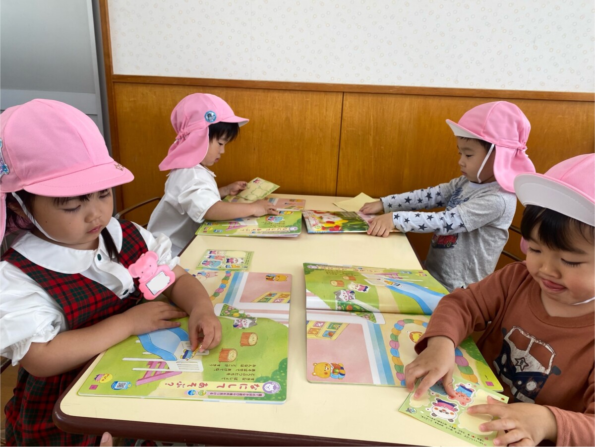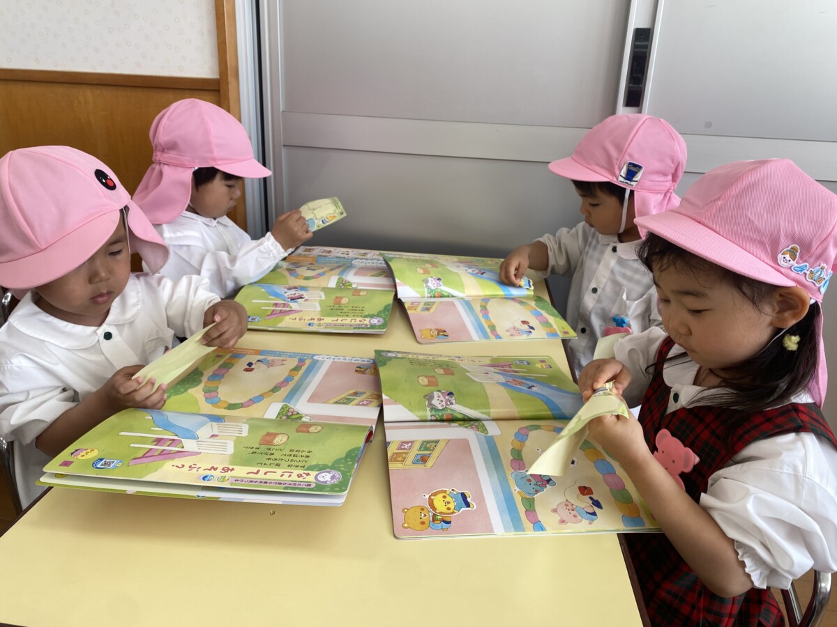 先週、月刊絵本のシール貼りをみんなでしました📖