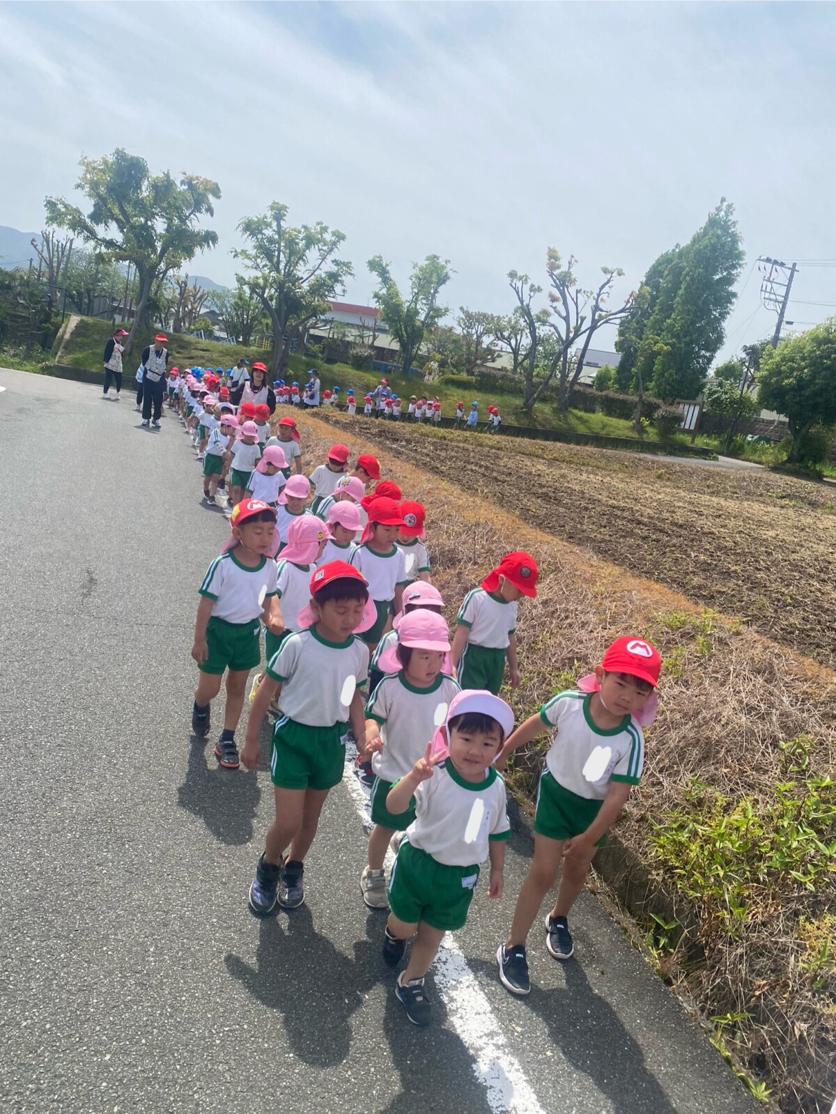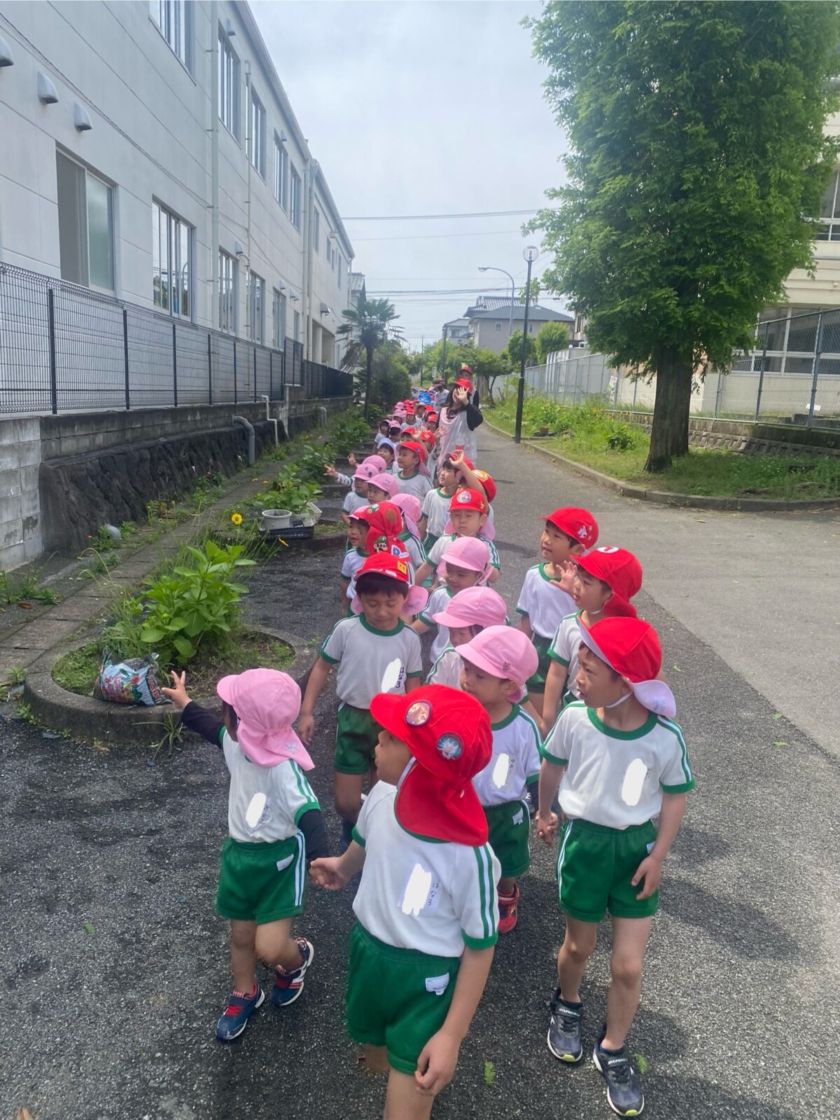 今日は体操が終わって、年長・はなぐみのおにいさん、おねえさんと手を繋いで園外に出てお散歩に行きました❕