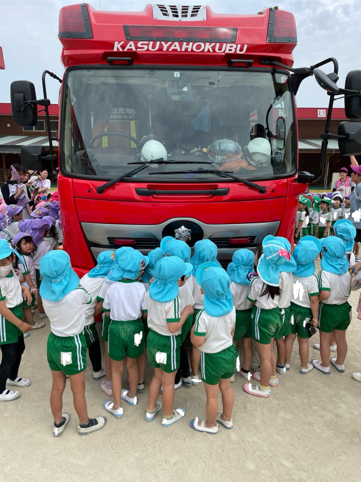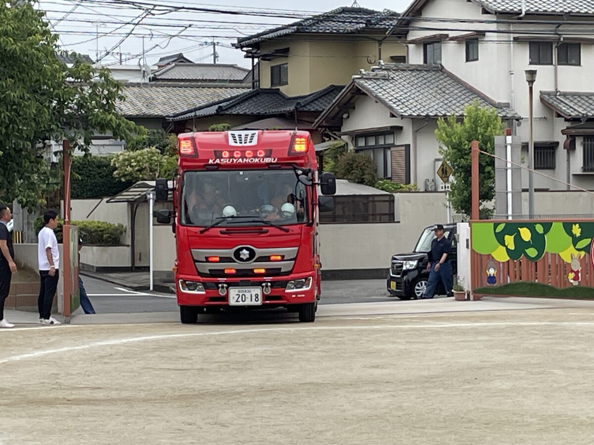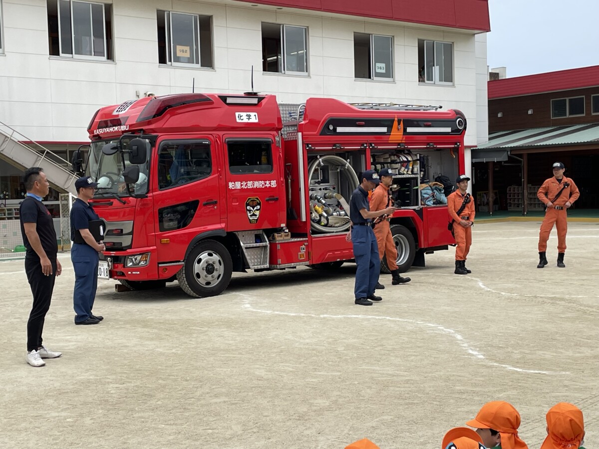 避難したあとに副園長先生と消防署の方のお話を聞いて、消防車が幼稚園に来てくれました🚒💨