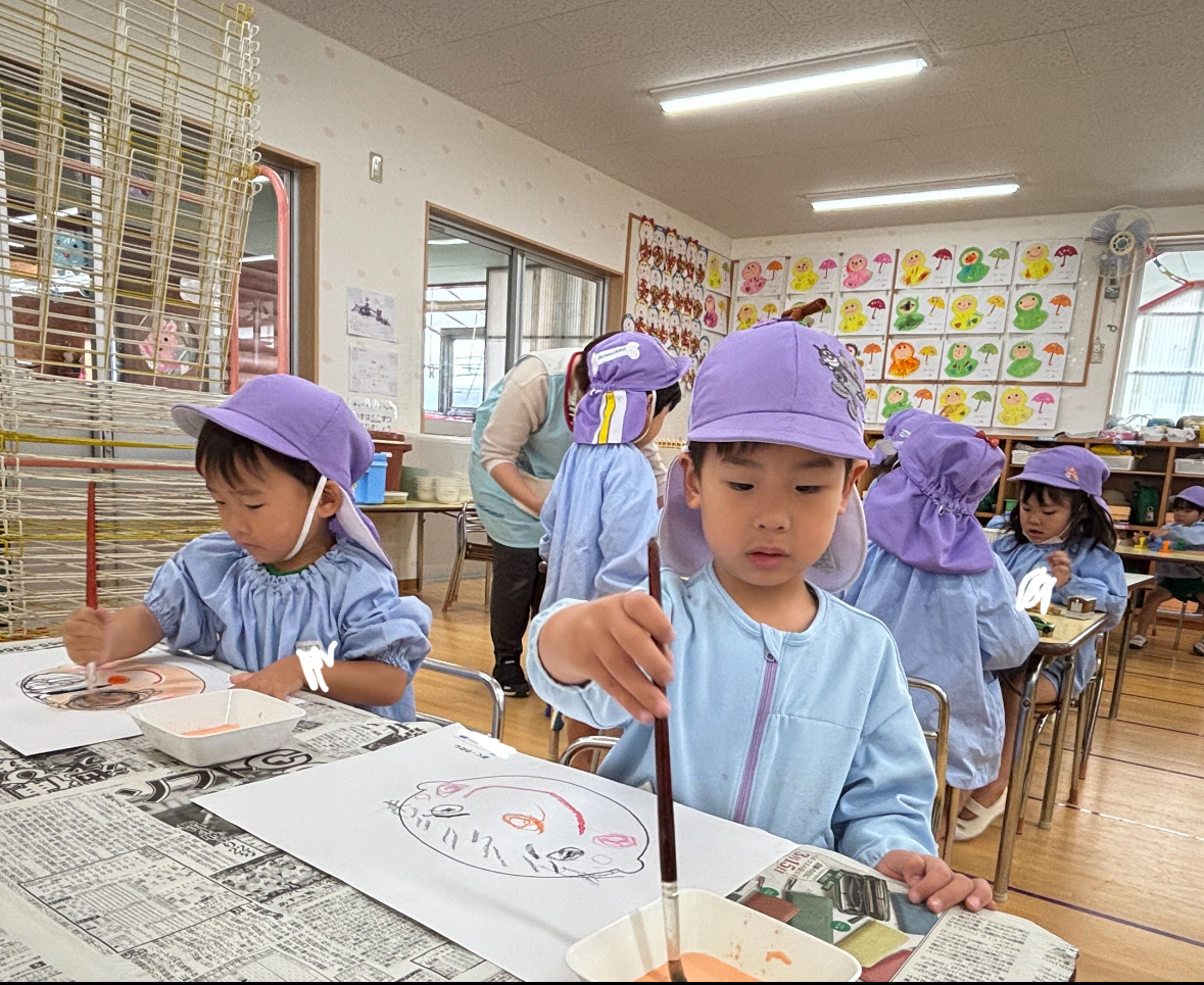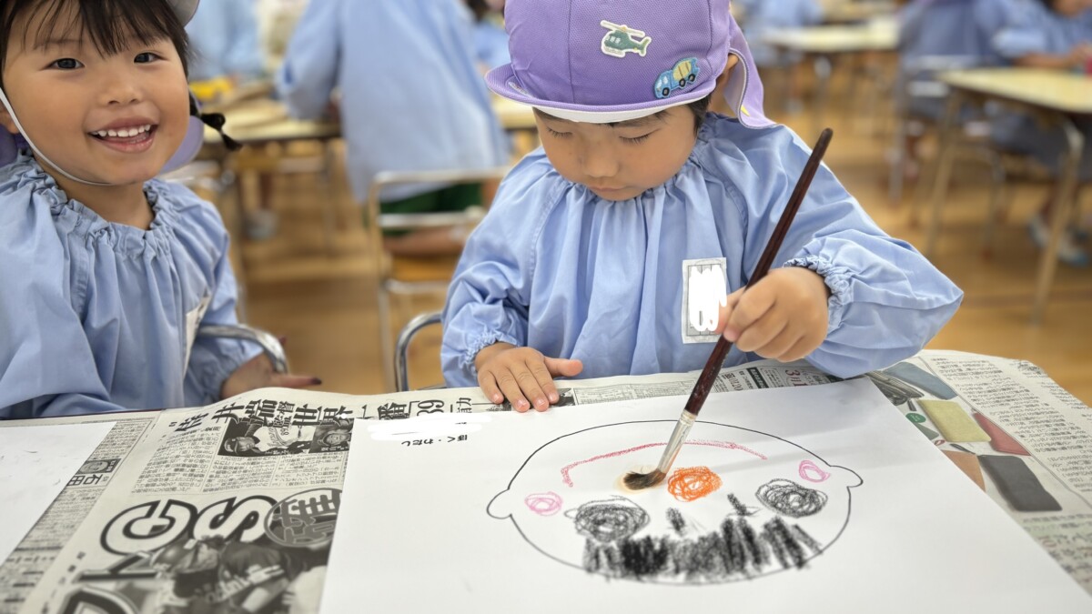 クレパスで顔を描いた後は、顔を肌色の絵の具で塗りました!