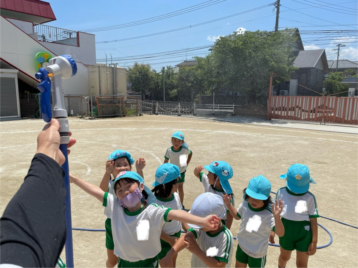 水遊びができない日もジョウロで水撒きをしてもらったり、ホースから出る霧の水を浴びたりして、水に親しんでいます。💦