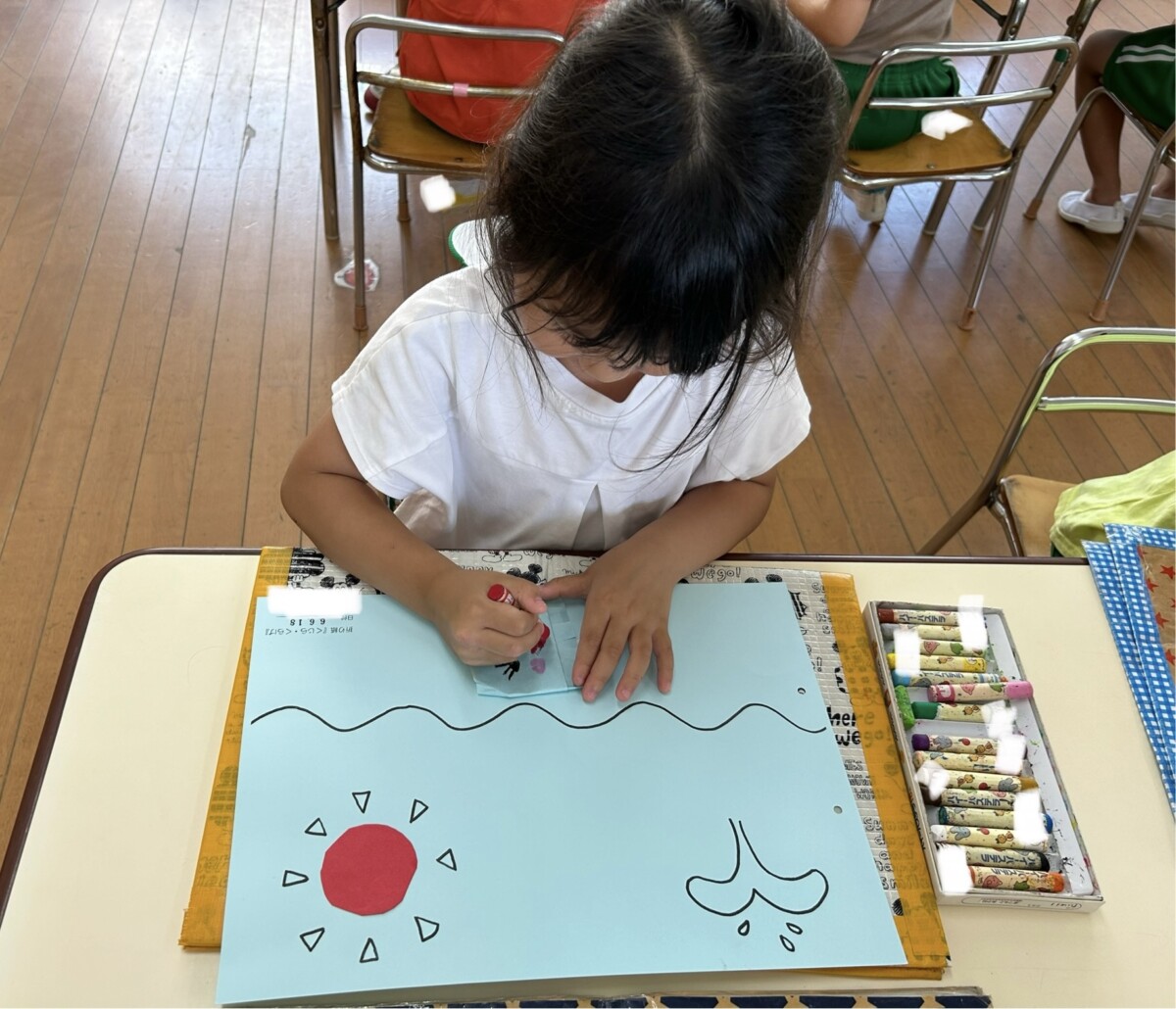今日つる1くみでは水曜日に折り紙を折って、のりで貼ったクラゲの折り紙に絵を描きましたよ