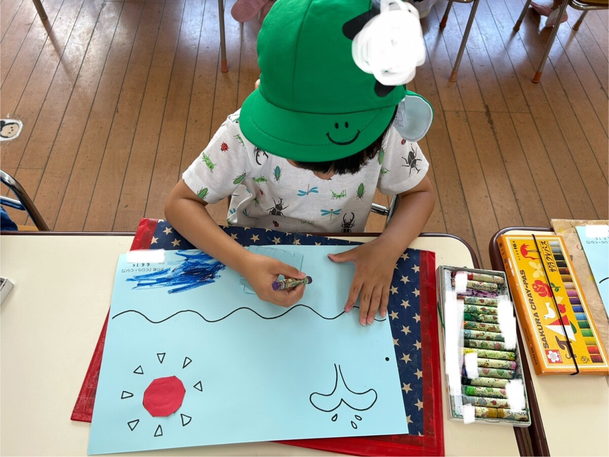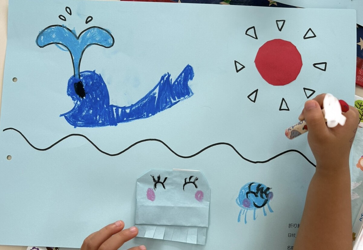 今回は折り紙だけではなくハサミを使って太陽の丸を切ったりクラゲの足を切ったりしました✂️