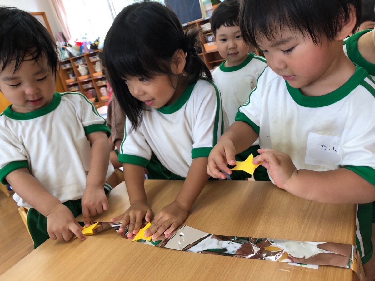七夕飾りの星をキラキラテープに貼りましたよ。