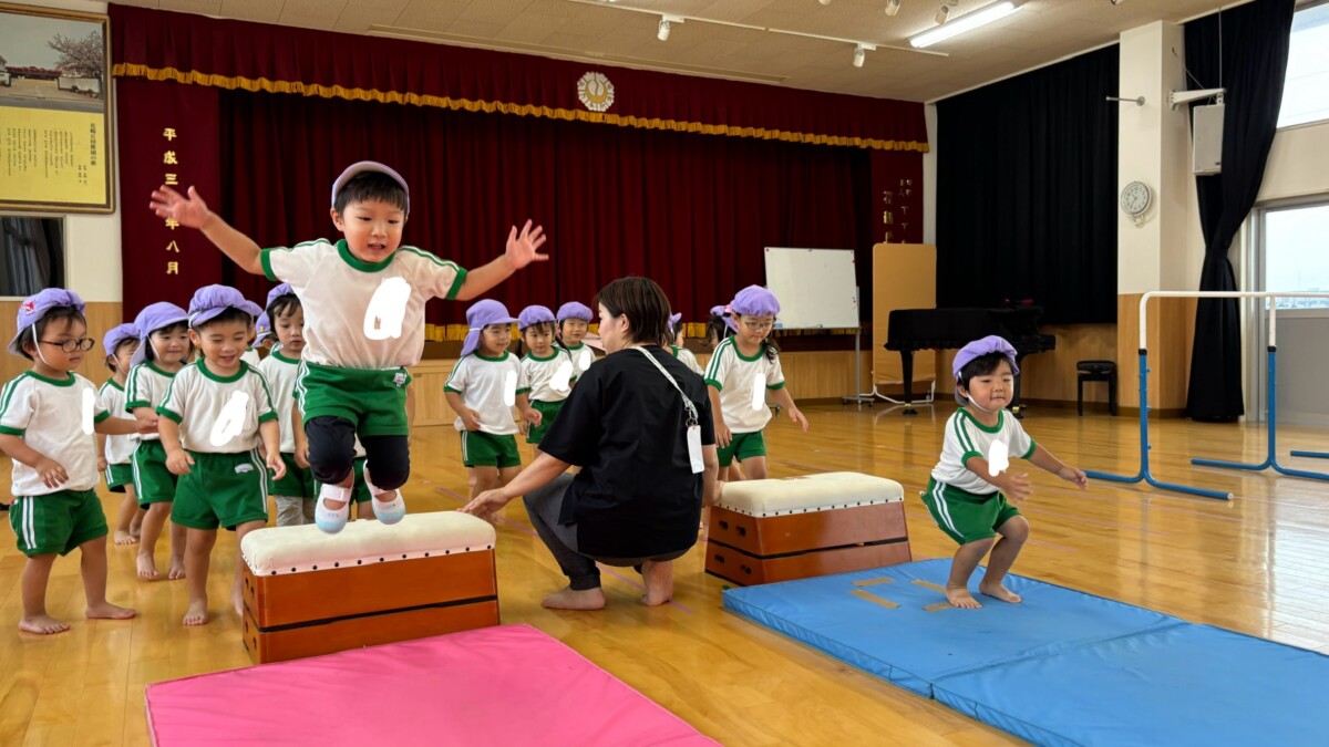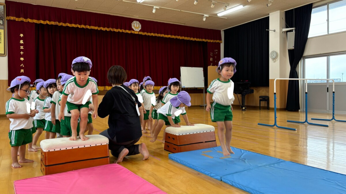 初めての跳び箱にワクワクドキドキの子どもたち。
