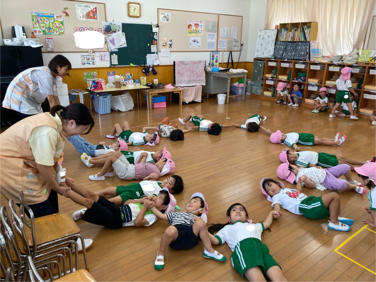 まず、手を繋いで輪になり、子どもたちは床に寝っ転がり準備をします😊