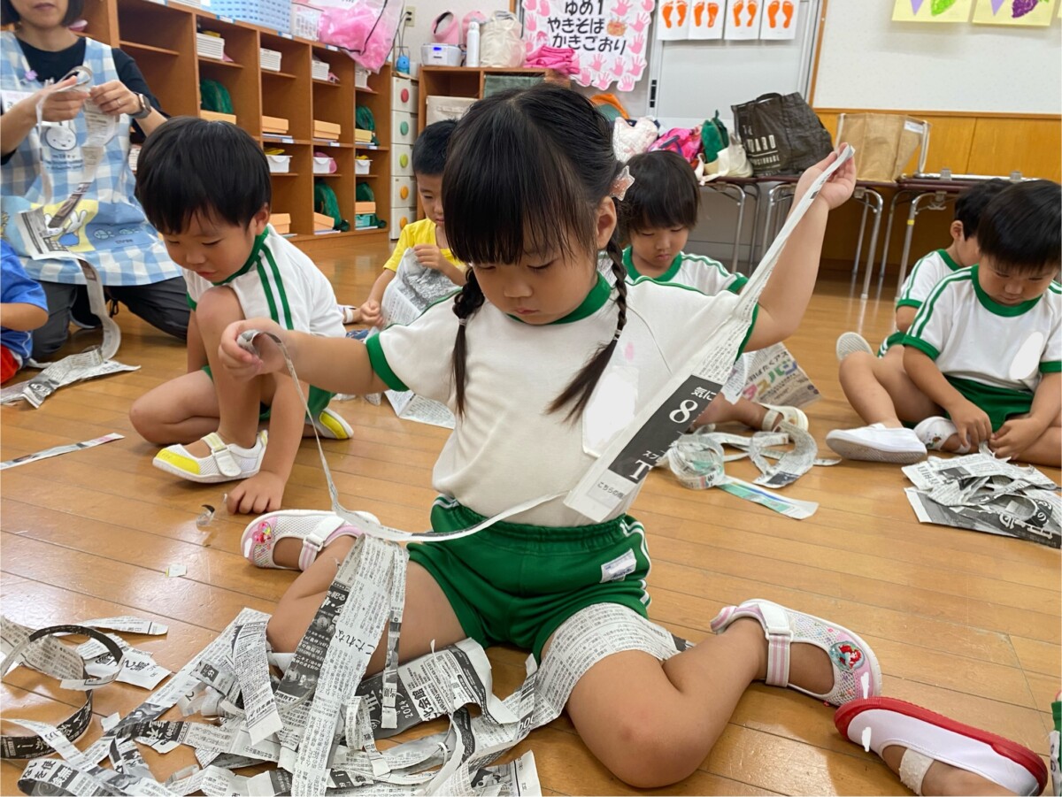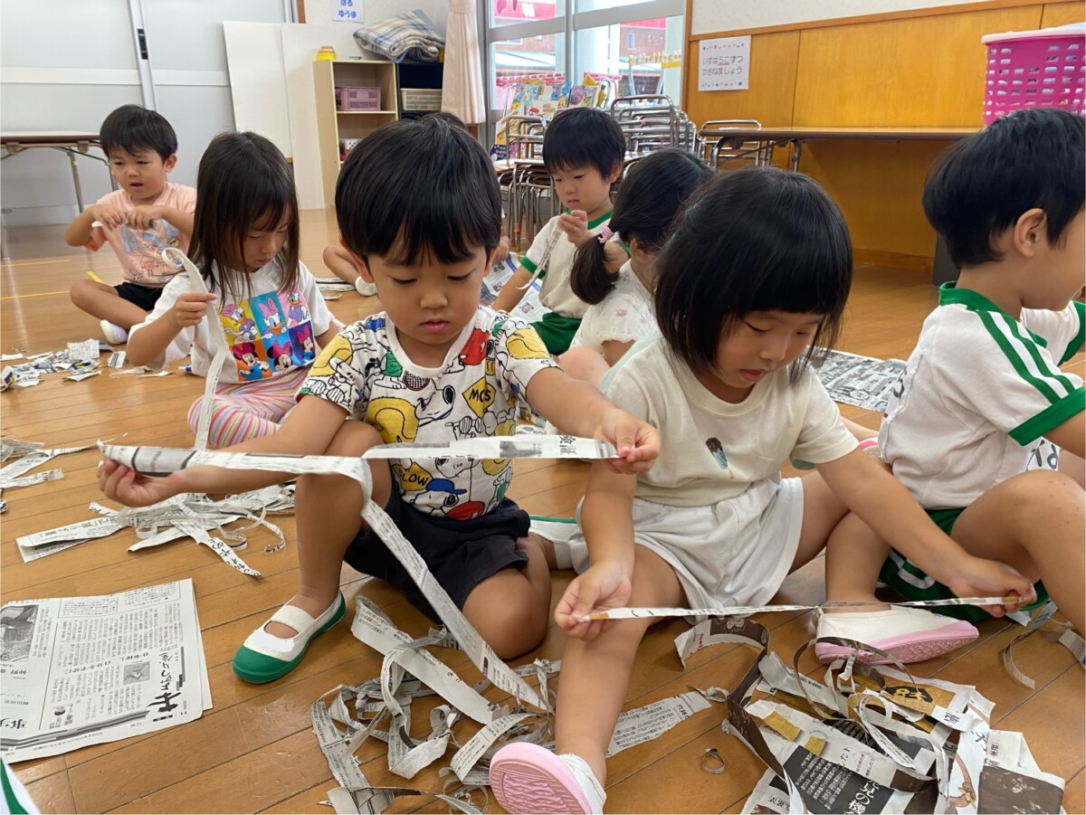 まずは新聞紙をビリビリと割いて、長く上手に出来ました👏✨