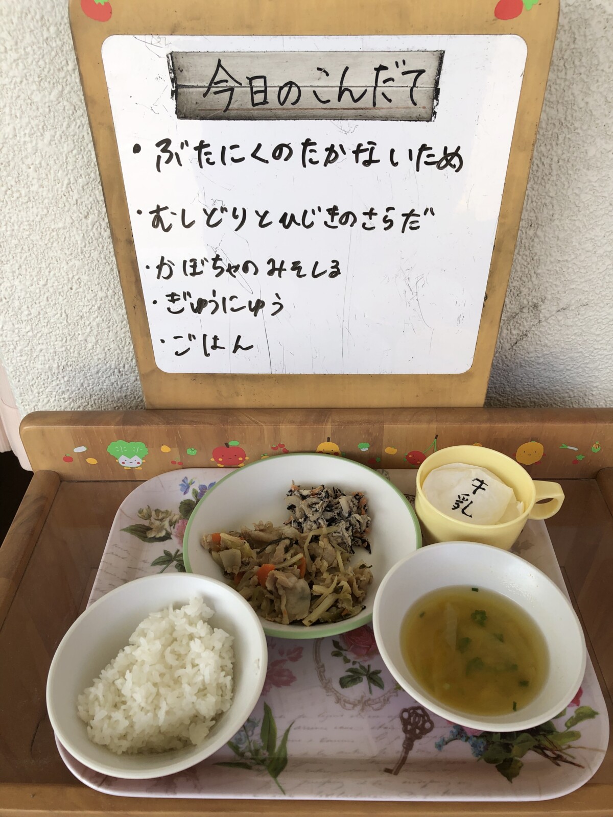 2024.11.14 花鶴丘幼稚園 お散歩に行ったよ! 今日も日中は暖かく過ごしやすい日でした。 今日は、たいよう1組2組合同で 2号公園にお友達と仲良く手を繋いで お散歩に行きました。 どんぐりや葉っぱを見つけるのに 夢中な子どもたち。 「見て、見つけたよ〜」 「葉っぱ、黄色!」 「たくさん、拾ったよ!」と 思い思いに秋の自然を感じながら 楽しんでいました。 今日の献立🍽️ 今日の担当はたいよう1組酒井でした。