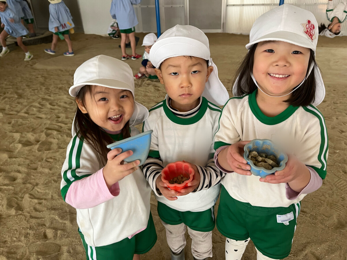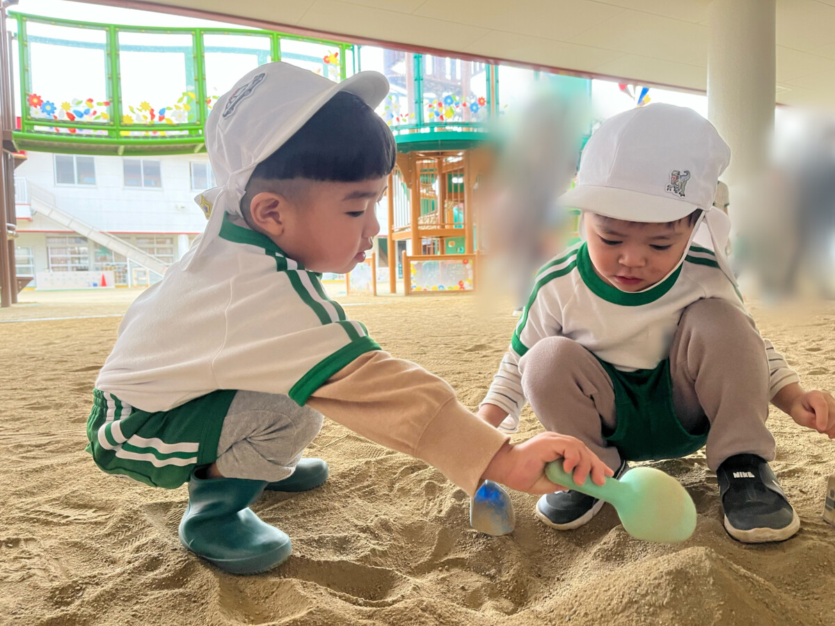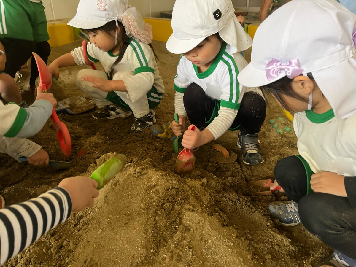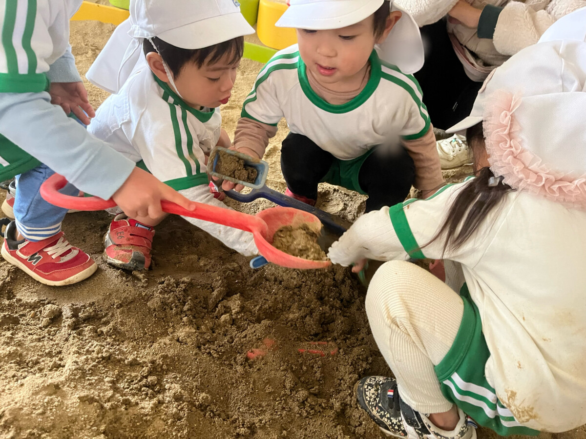 はなぐみさんが水を入れてくれると、たいようぐみの子どもたちが砂をほぐして、まぜまぜ😌