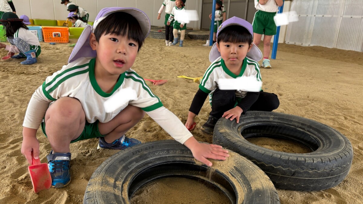 砂遊びでは、スコップ等で砂を集めてお山を作ったり、