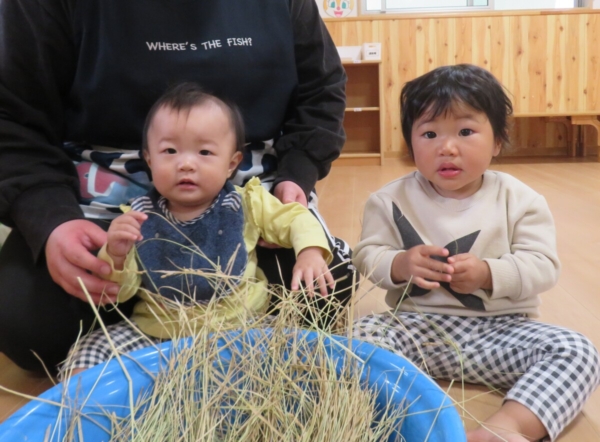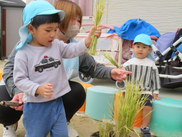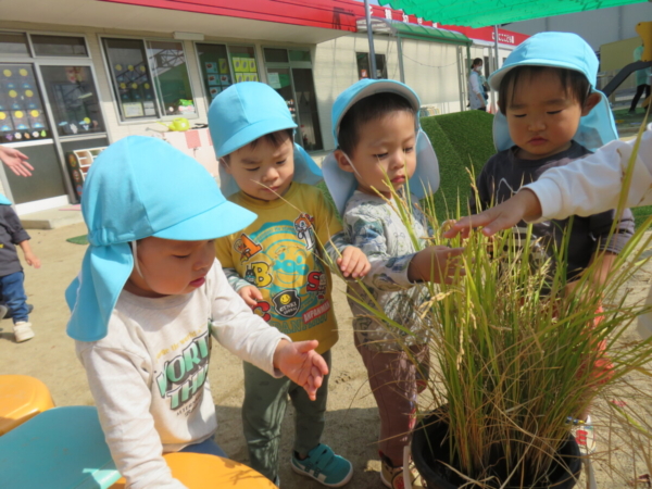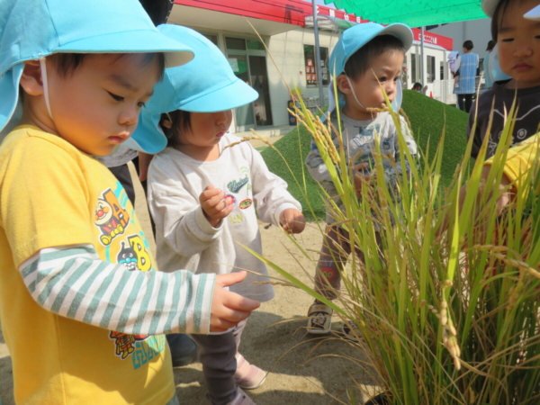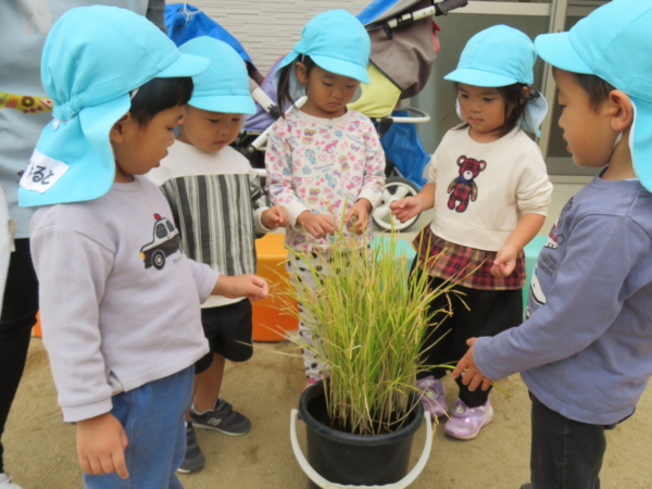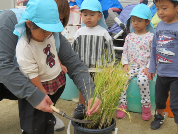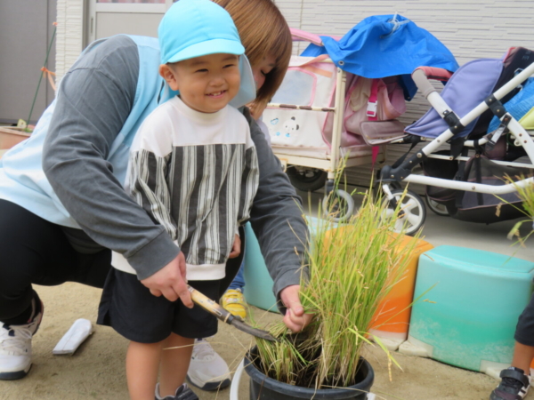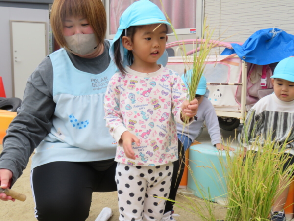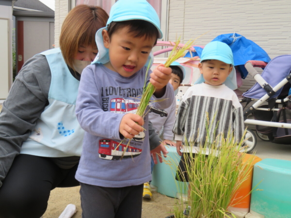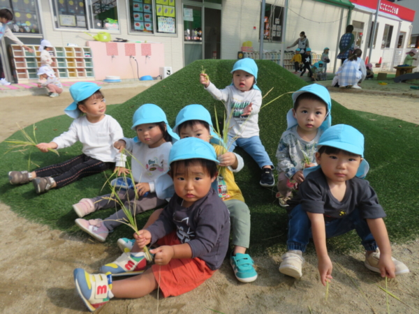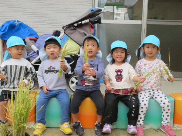 10月末に、にこにここども園のお友達が先生と一緒に稲刈りをしました!稲がお米になるお話を聞いて興味津々の子どもたち。実際に稲作体験したり、稲穂に触れて良い経験ができました。食育の一環として大切なお米を頂けることに感謝しながら、より美味しく楽しく食事が出来るように願っています。可愛い素敵な表情でいっぱいです。