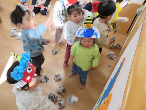 鬼さんの登場に子どもたちは興味深々、驚いたり泣いちゃったり、鬼をじっと見て立ち向かおうとしたりいろんな表情がみれました!