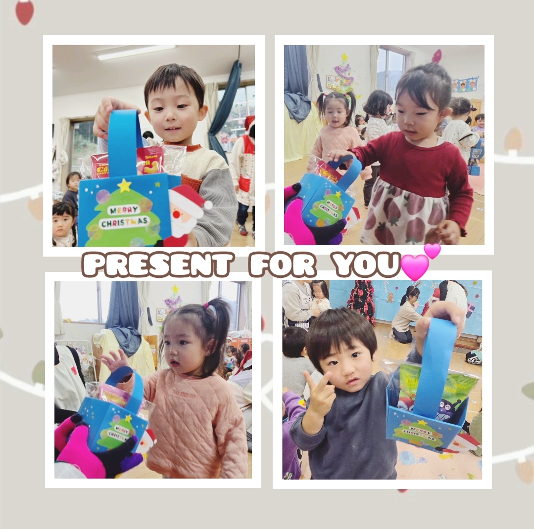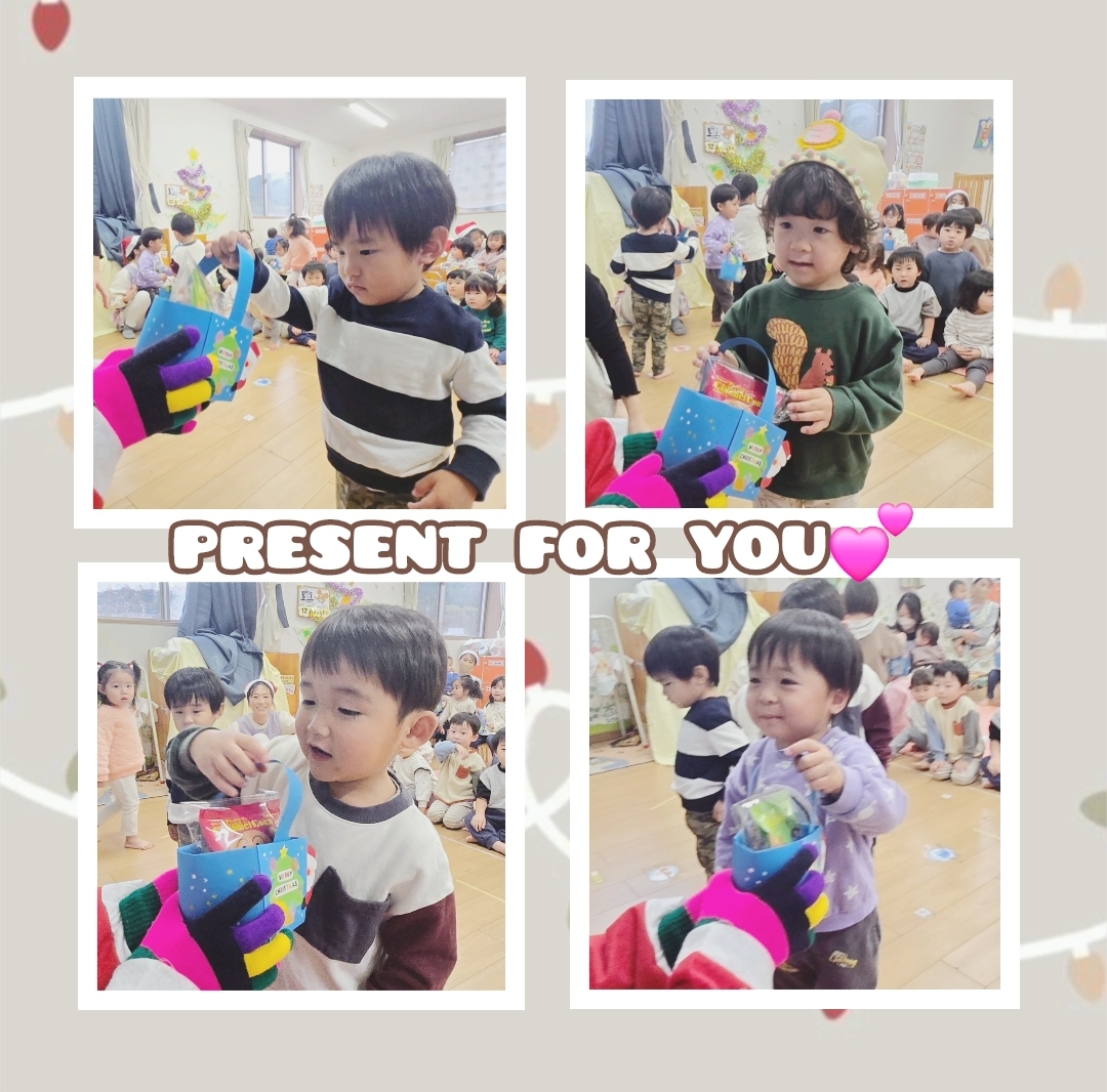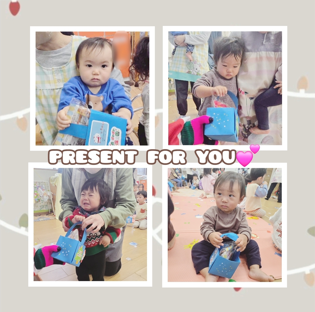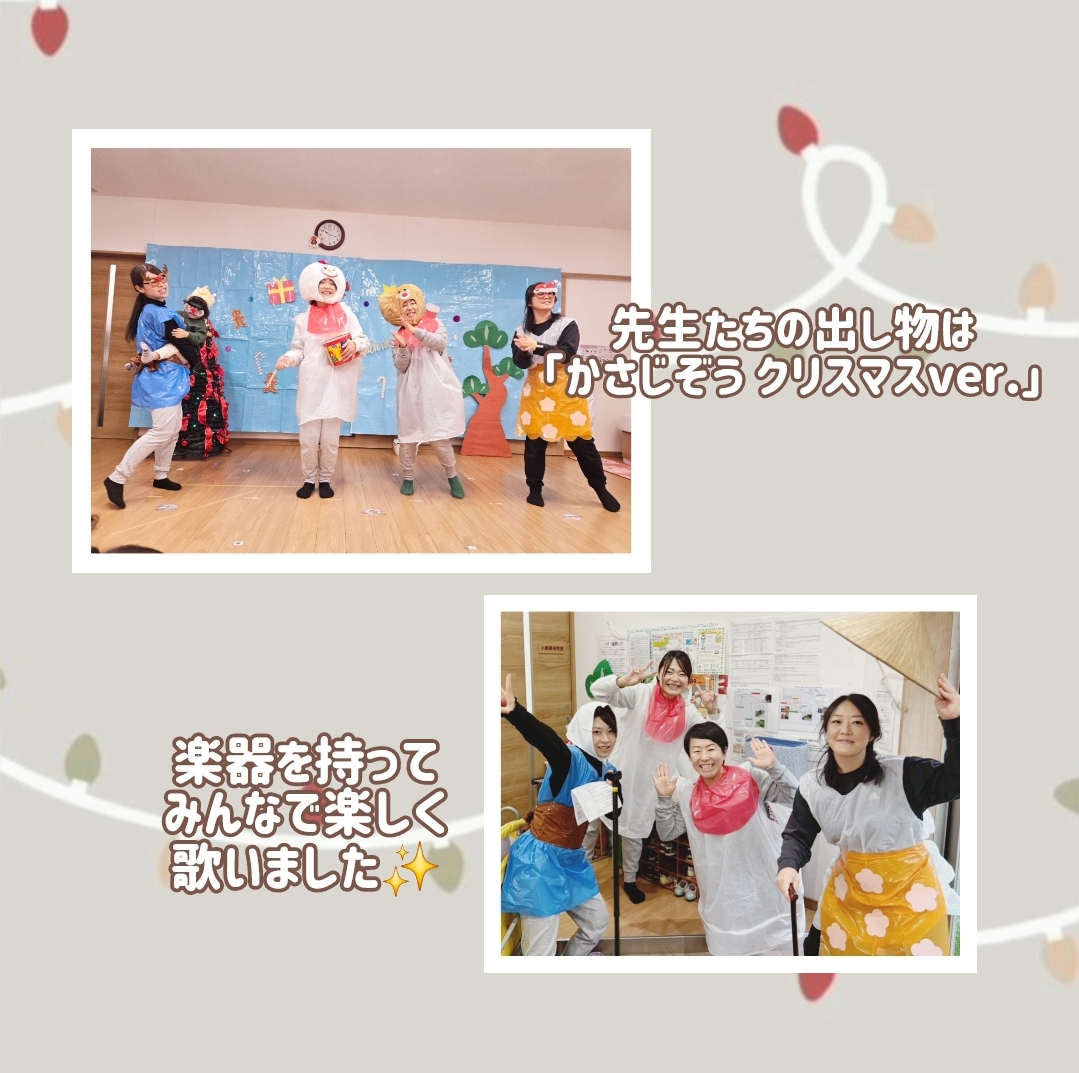かさじぞうクリスマスVer.はみんなで楽しく合奏をしましたよ~!そしてそして!サンタさんの登場です🎅待ちに待ったプレゼントを受け取るとお目目がキラキラ✨サンタさんにありがとう!をしっかり言えた子どもたち。バイバイする時は寂しそう…でもハイタッチをして「発表会頑張ります!」とお約束をしました!