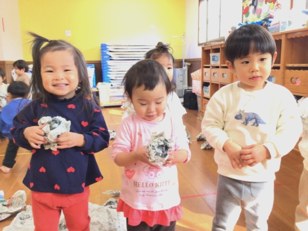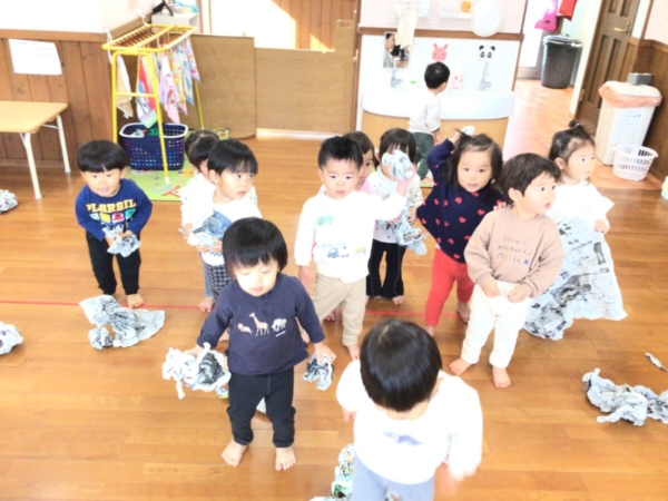 遊ぶ前に新聞紙を持って「これなーんだ」と見せると不思議そうに見ているお友達や「新聞紙」と元気よく答えてくれるお友達がいましたよ!