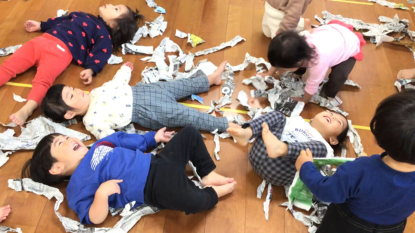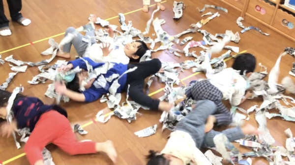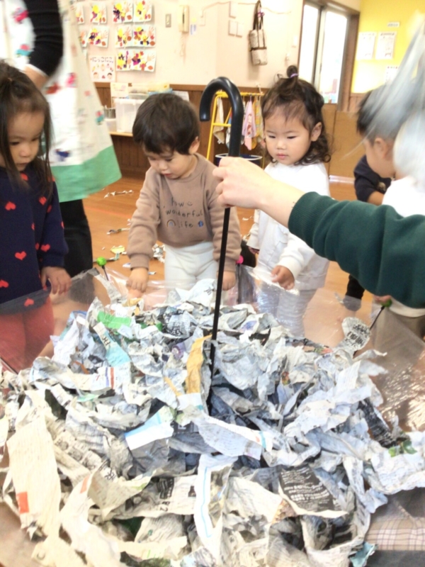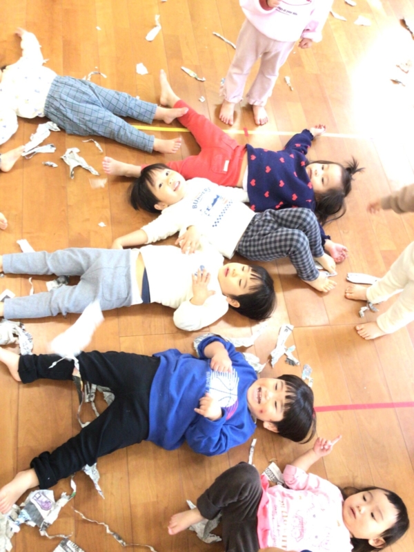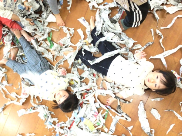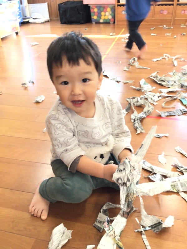 破いた新聞紙がたくさん出来るとプールのように泳いでみたり、上から降ってくる新聞紙に大興奮の子どもたちでした♡