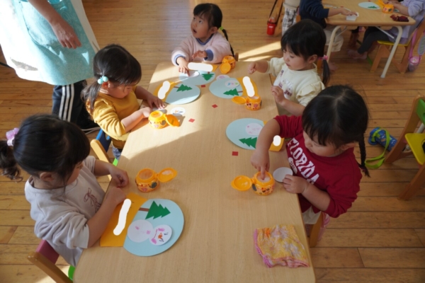 今日の2歳児さんは12月の制作『スノードーム』を作りました!