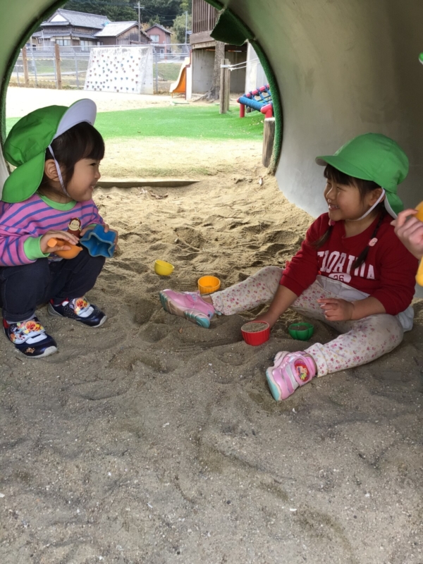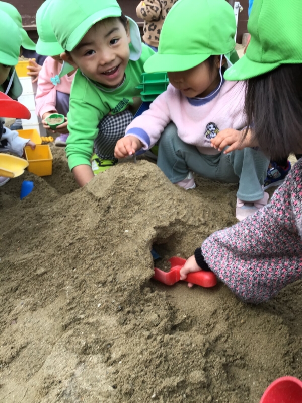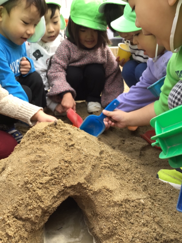 お砂場でお山を作り、穴を空けてみます(・o・)
