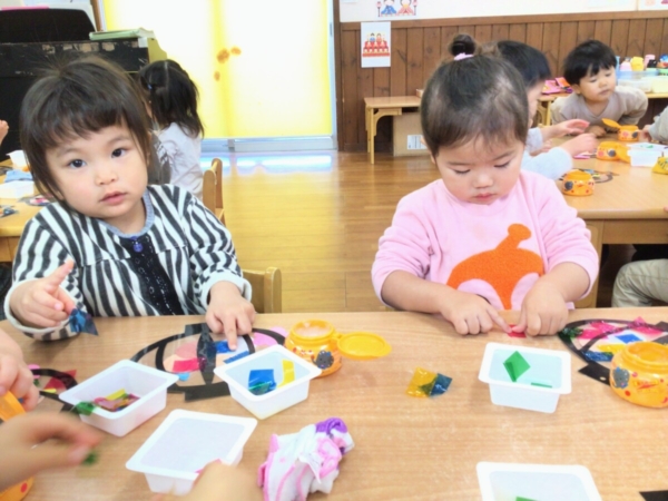 手にのりが付いておりセロハン貼りに苦戦するお友達もいました!