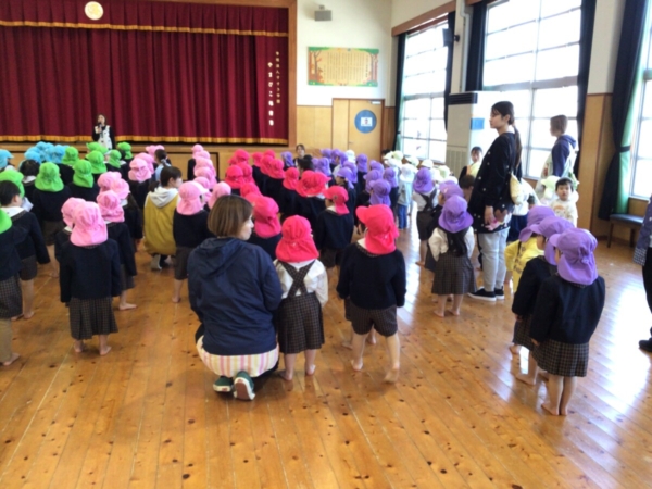 うしろに静かに座り、園長先生のお話を聞いたり