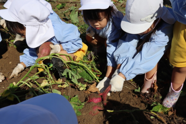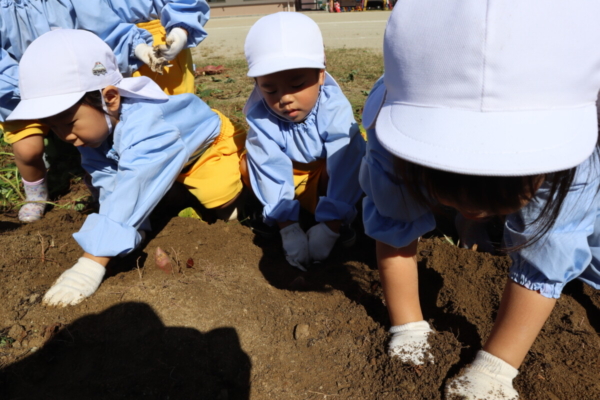 土に埋もれている芋を見つけて「ここにある!」とニコニコな子ども達(^_-)-☆