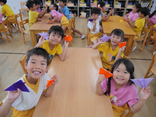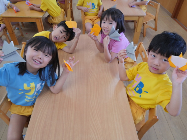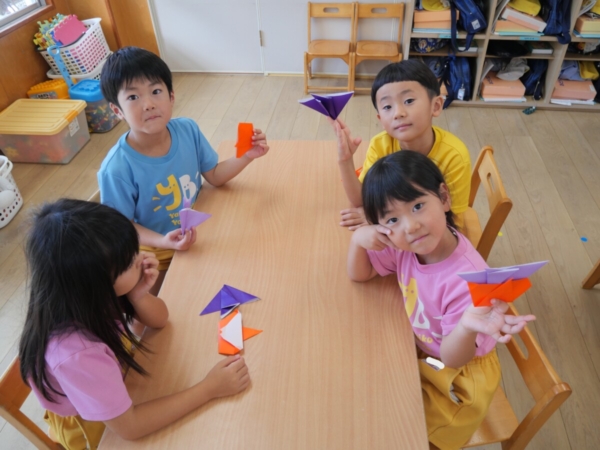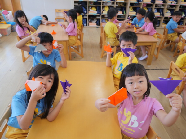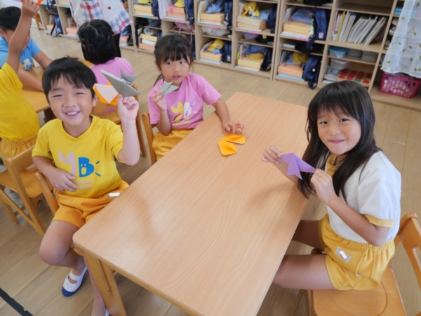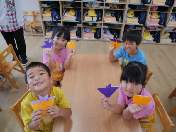 折り紙製作では、ハロウィンのこうもりとジャックオーランタンを作りました✨