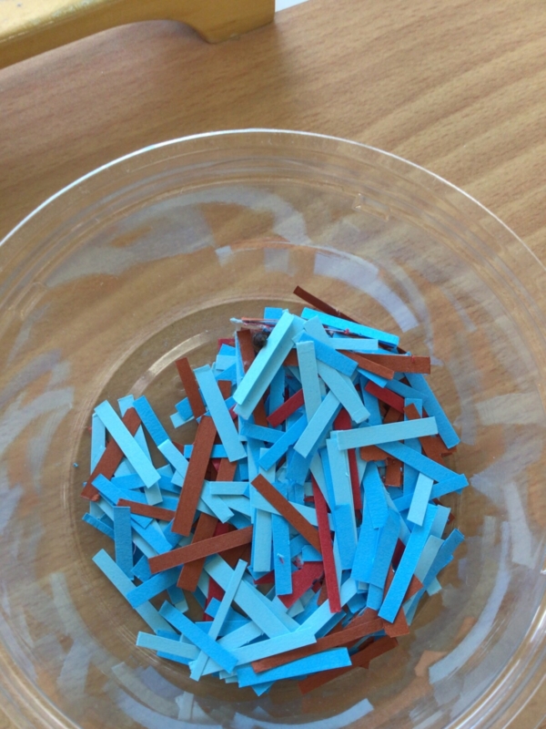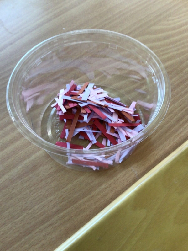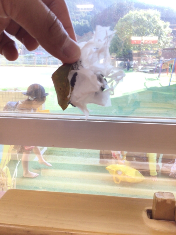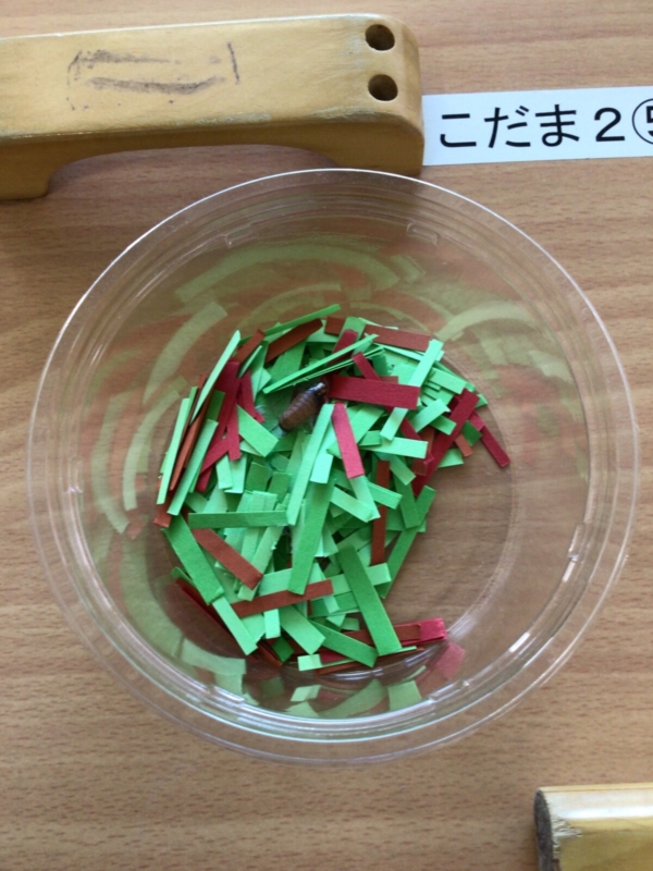 色画用紙を細かくして、その中にみのむしを入れています。
