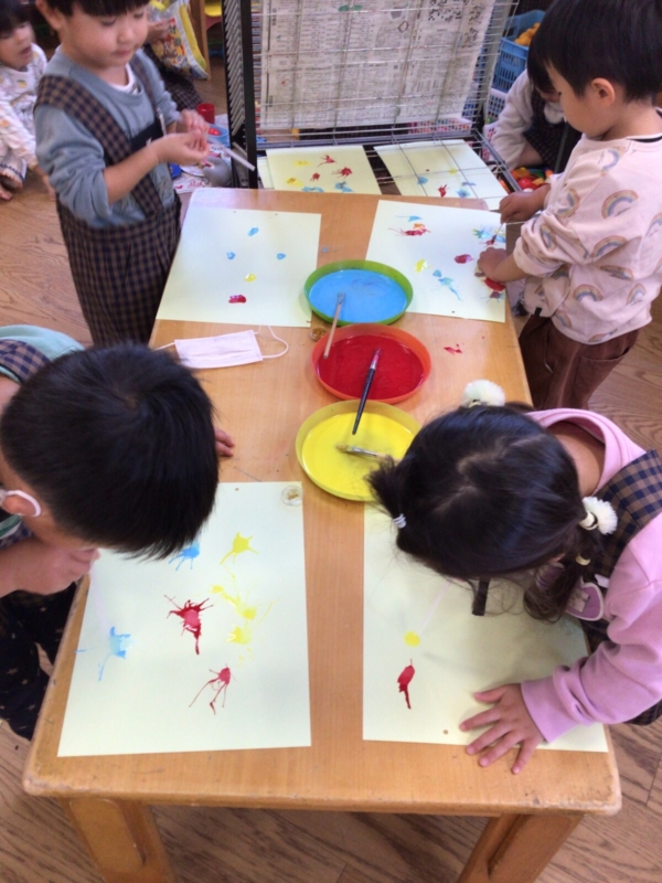 そして、今日は絵の具を使って吹き絵に挑戦した3くみさん🎨